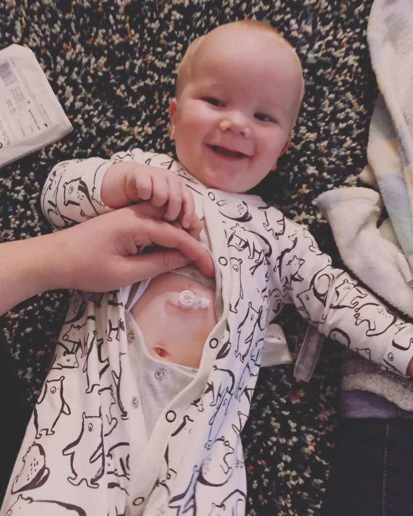 At five months, Luca was fitted with a nasogastric (NG) tube into his stomach via his nose for feeding and then later had a percutaneous endoscopic gastrostomy, a procedure in which a flexible feeding tube is placed through the abdominal wall and into the stomach, otherwise known as having a PEG fitted. The PEG allows nutrition to go directly into the stomach, bypassing the mouth and oesophagus.