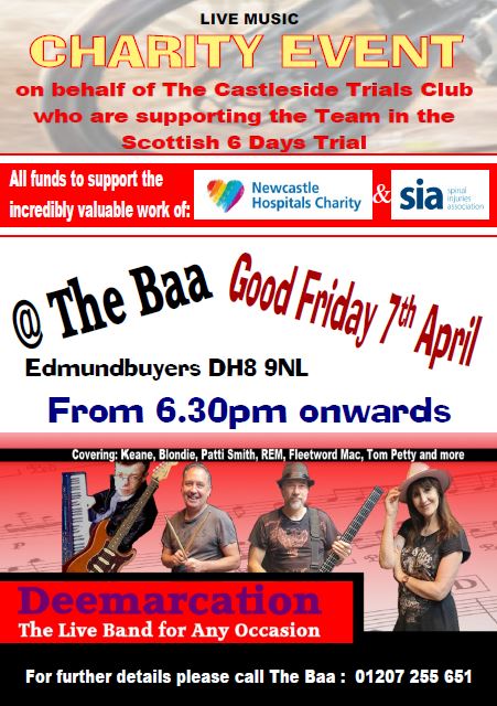 On Friday 7th April 2023 (Good Friday), a night of live music with local band Deemarcation will be held at The Baa. This event, organised by The Castleside Trials Club, hopes to raise funds for Newcastle Hospitals Charity and the Spinal Injuries Association.