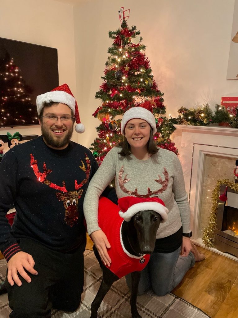 Above: Siân with her partner and dog, showing off their Christmas Jumpers!